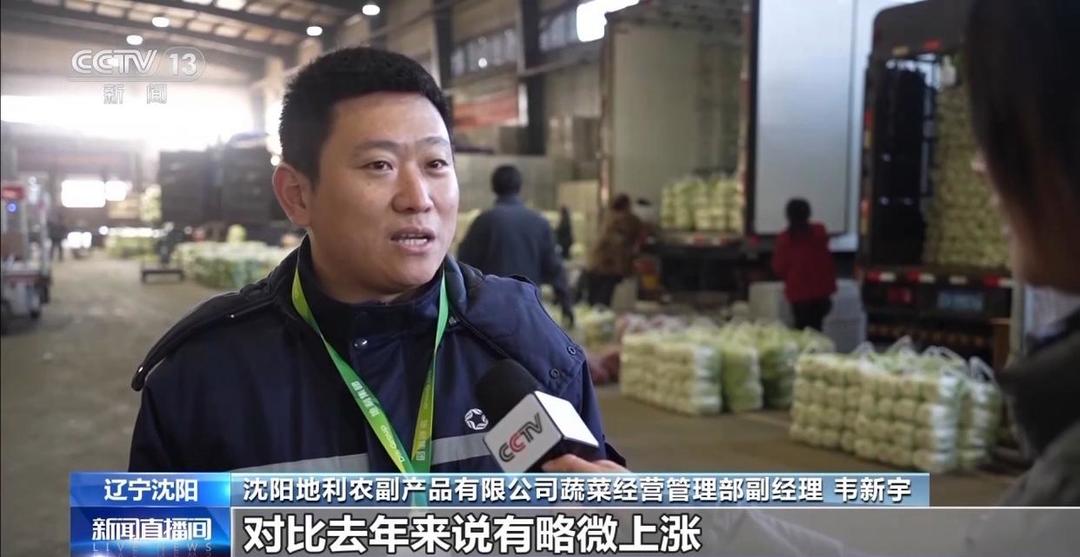 沈阳地利农副产品有限公司蔬菜经营管理部副经理 韦新宇:今年的秋菜交易量对比去年来说有略微上涨,目前秋菜的交易品种有白菜、大葱、土豆、萝卜等,白菜每天的交易量大概能有300多吨,每天能到20多车,就是大车型。