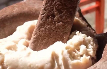 年糕以大米或糯米为主要原料,经浸泡、磨粉、蒸制、捶打等多道工序制成。随着蒸汽喷薄而出,伴着本地新米独有的醇厚香气,捣年糕的重头戏也正式开场。一人抡起沉重的石杵重重砸下,另一人瞅准时机默契配合,将烫手的米粉团快速翻转、折叠。将捶打到位的米粉团揉搓、用模具压制后,一个个年糕就制作完成了。