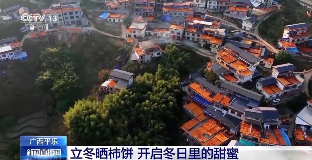 房前屋后、院落屋顶,一片片整齐晾晒的柿饼也成为立冬时节里的独特景观。目前,平乐县柿子的鲜果年产量达62万吨,拥有柿子加工企业240多家,加工制品年产量45万吨。甜蜜的柿饼不仅是冬日里的特色小吃,也带动了村民增收致富。