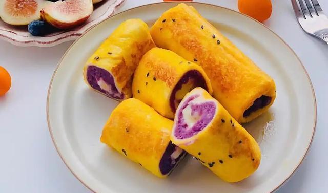 7. 平底锅中倒入少许食用油,烧热后放入紫薯芝士卷,小火煎至两面金黄,熟透即可。