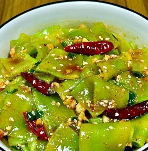 2、莴笋加入辣椒面、葱段,热锅冷油放入干辣椒、花椒、蒜末,小火炒出香味,淋到莴笋上,加2勺生抽、2勺陈醋、1勺香油、少许砂糖,搅拌均匀即可。
