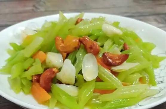 西芹、红椒、腰果、蒜片、蚝油、盐、糖