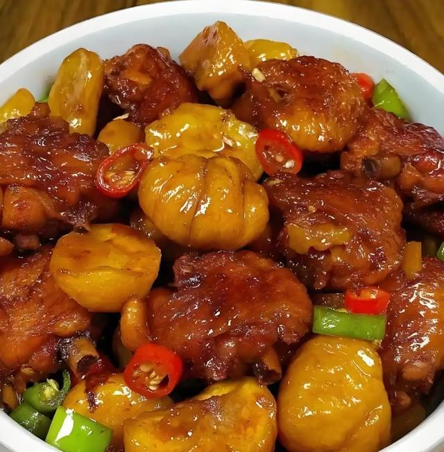 7. 见汤汁亮油裹住板栗与鸡块,撒葱花,关火再焖2分钟让味道回透,即可装盘。