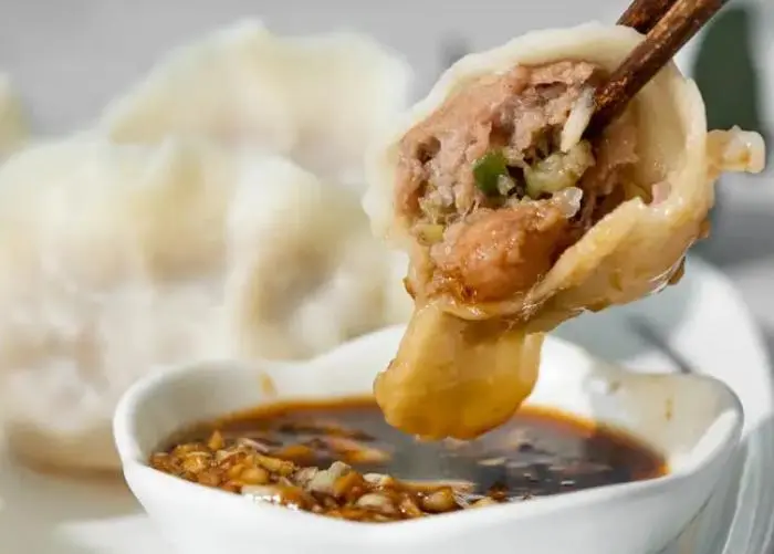 这款水饺皮薄、馅大、汁浓、味美,吃的时候蘸上当地特色酱料,风味立显。