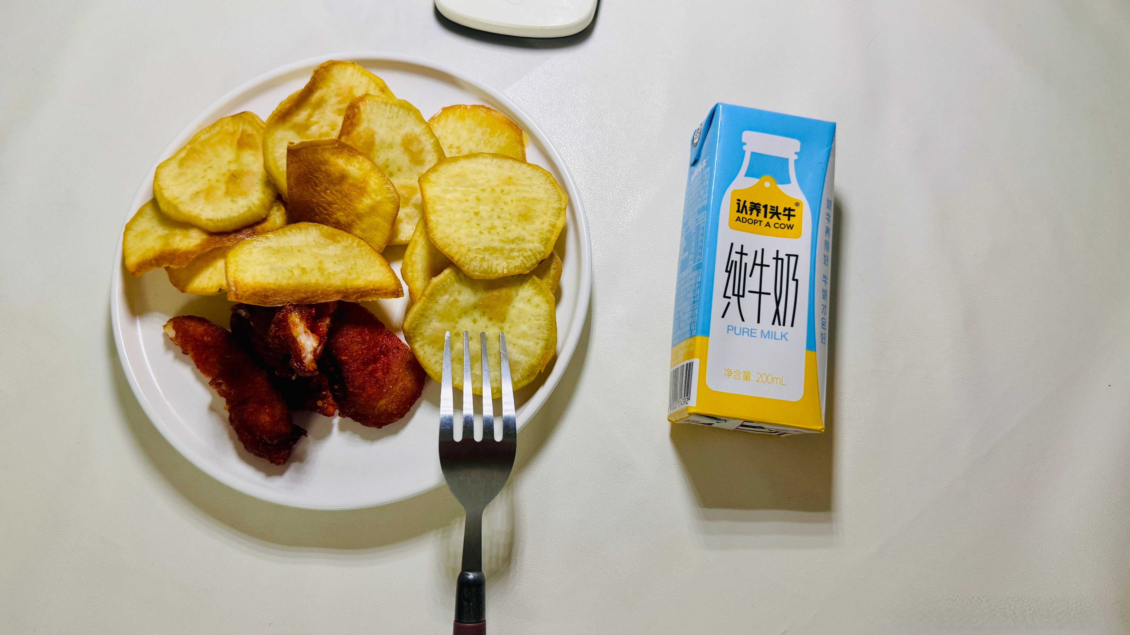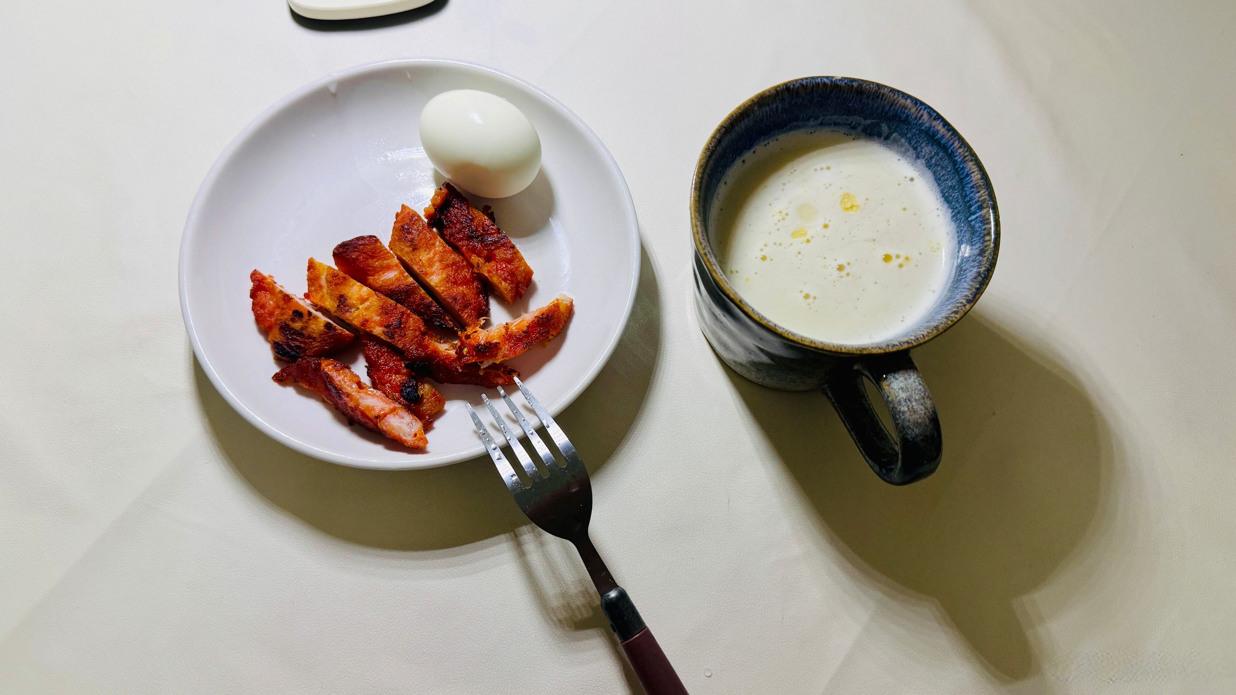 水煮蛋,煎鸡排,豆奶。问她想吃什么,她说吃点肉吧,但所有肉类之中也就鸡肉她最喜欢,煎了一块鸡排倒是吃了几口。