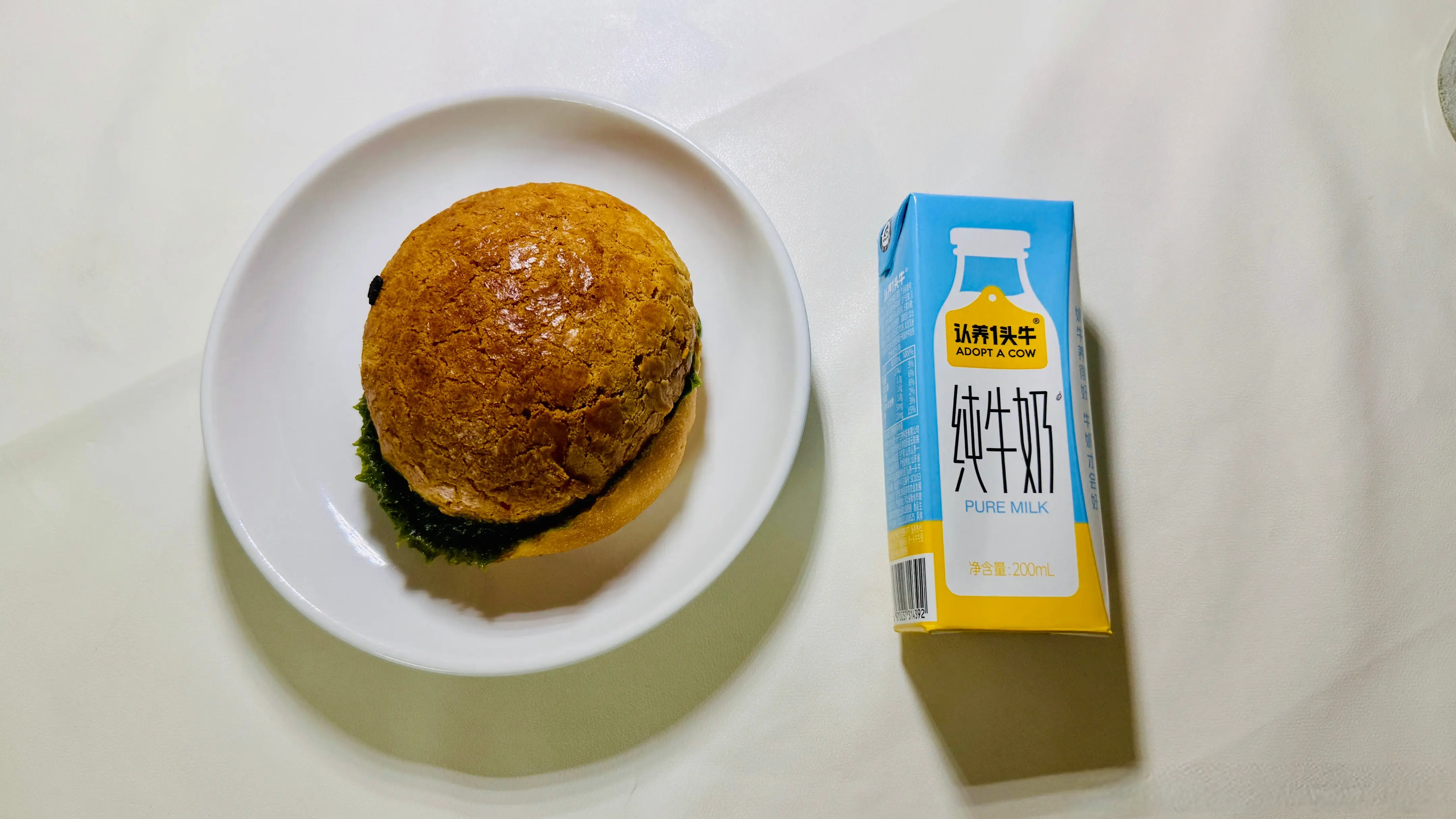 菠萝包。这是在她们校门口买的,晚上下自习的时候她说想吃,买了两个,一个当时回家就吃了,另一个她说准备当早餐时,其实早上热了之后,又说没有胃口了,结果没吃,吃了一小块饼干,把牛奶带学校了。我现在也看开了,早上吃不下去就带点到学校里面,课间吃点面包,蛋糕,喝点牛奶吧。