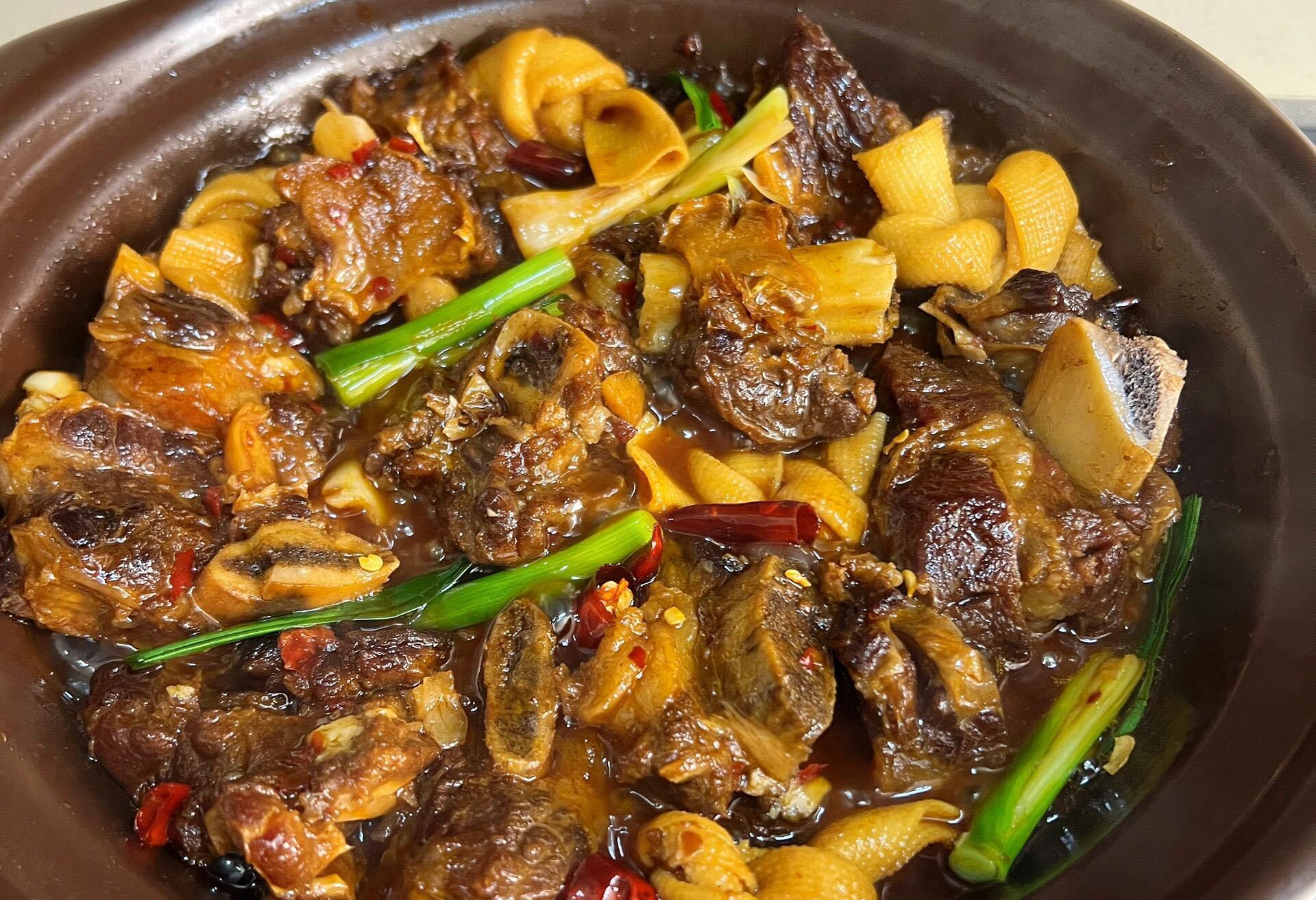 砂锅炖煮:将炒好的牛排骨转入砂锅中,加入千张结和蒜苗炖煮片刻。砂锅的保温效果使牛排骨更加鲜美入味,千张结和蒜苗的加入也增加了菜肴的口感层次。