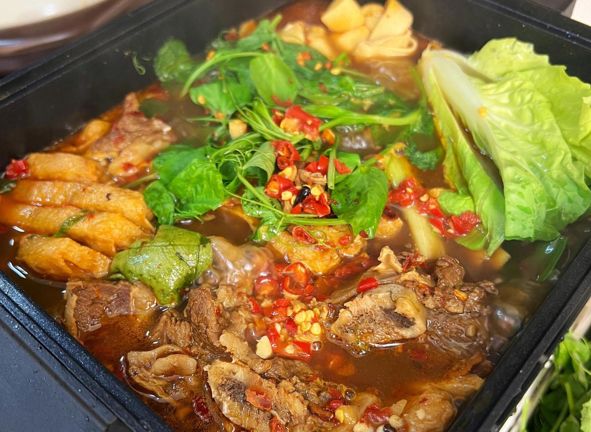 准备火锅:将炖好的牛腩连同汤汁一起倒入火锅内,加入少许鸡精和剁辣椒提升风味。然后准备自己喜欢的配菜,如土豆片、金针菇等,与牛腩一起涮煮享用。