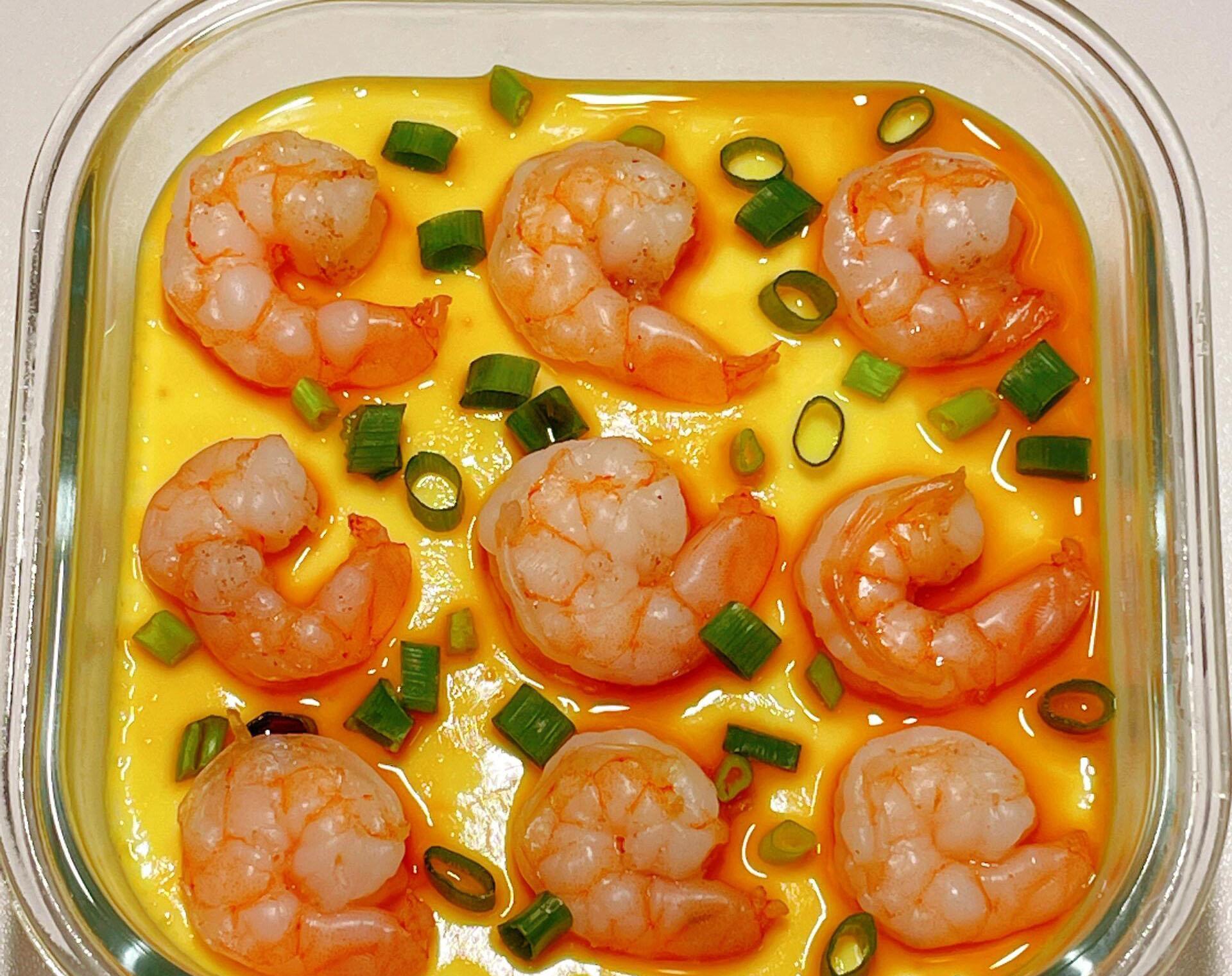 调味装盘:将蒸好的虾仁鸡蛋羹取出后,将虾仁摆放在鸡蛋羹表面。然后倒一点生抽增加风味,撒上葱花