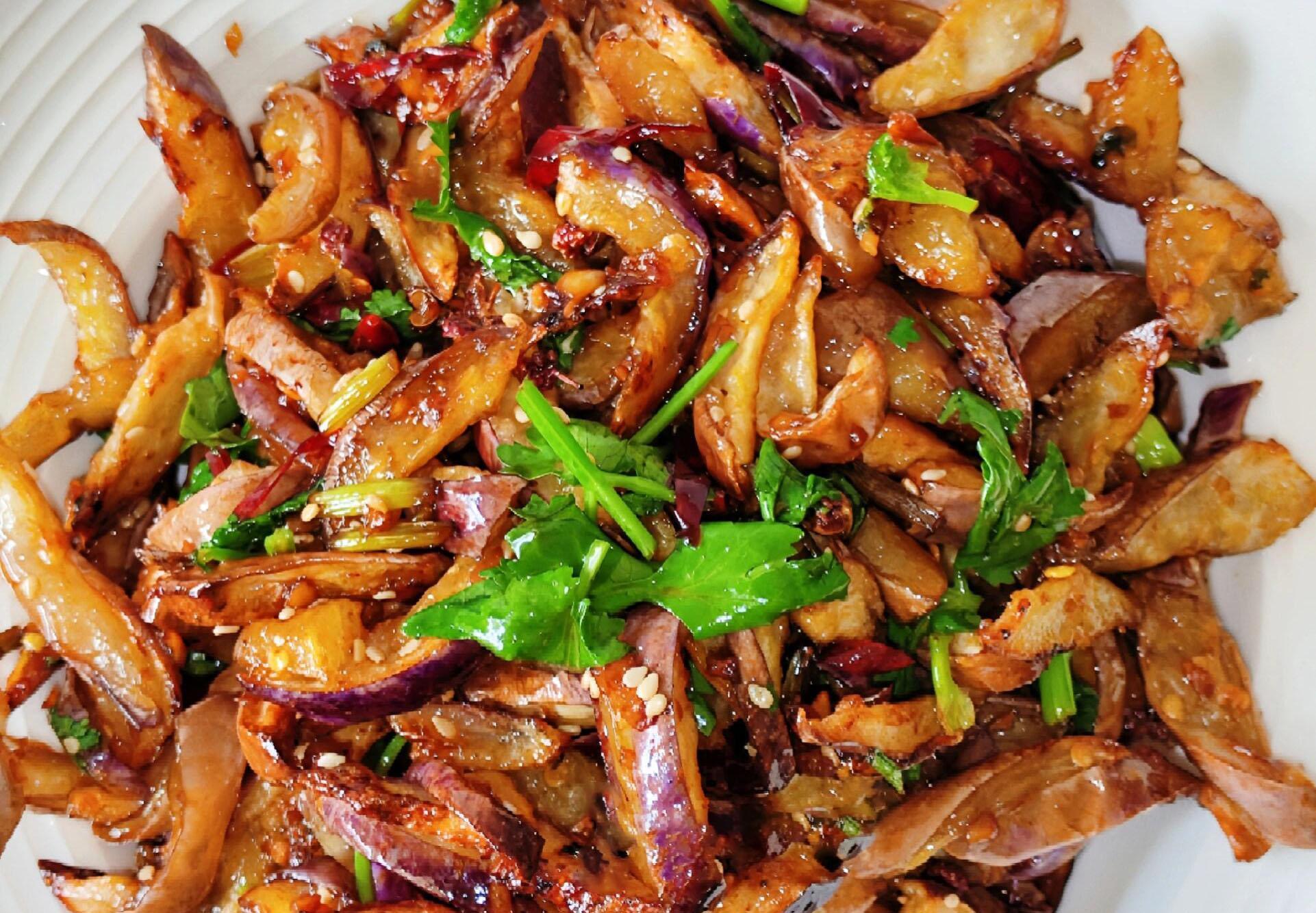 翻炒茄子:将烤好的茄子条倒入锅中与配料翻炒均匀。使每一根茄子条都能充分吸收配料的味道和香气。