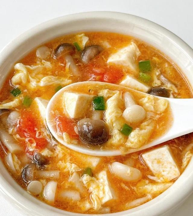 番茄的维生素 C 能促吸收,菌菇补微量元素,豆腐和鸡蛋提供双蛋白,汤品温热不刺激,秋冬喝暖身又养人。