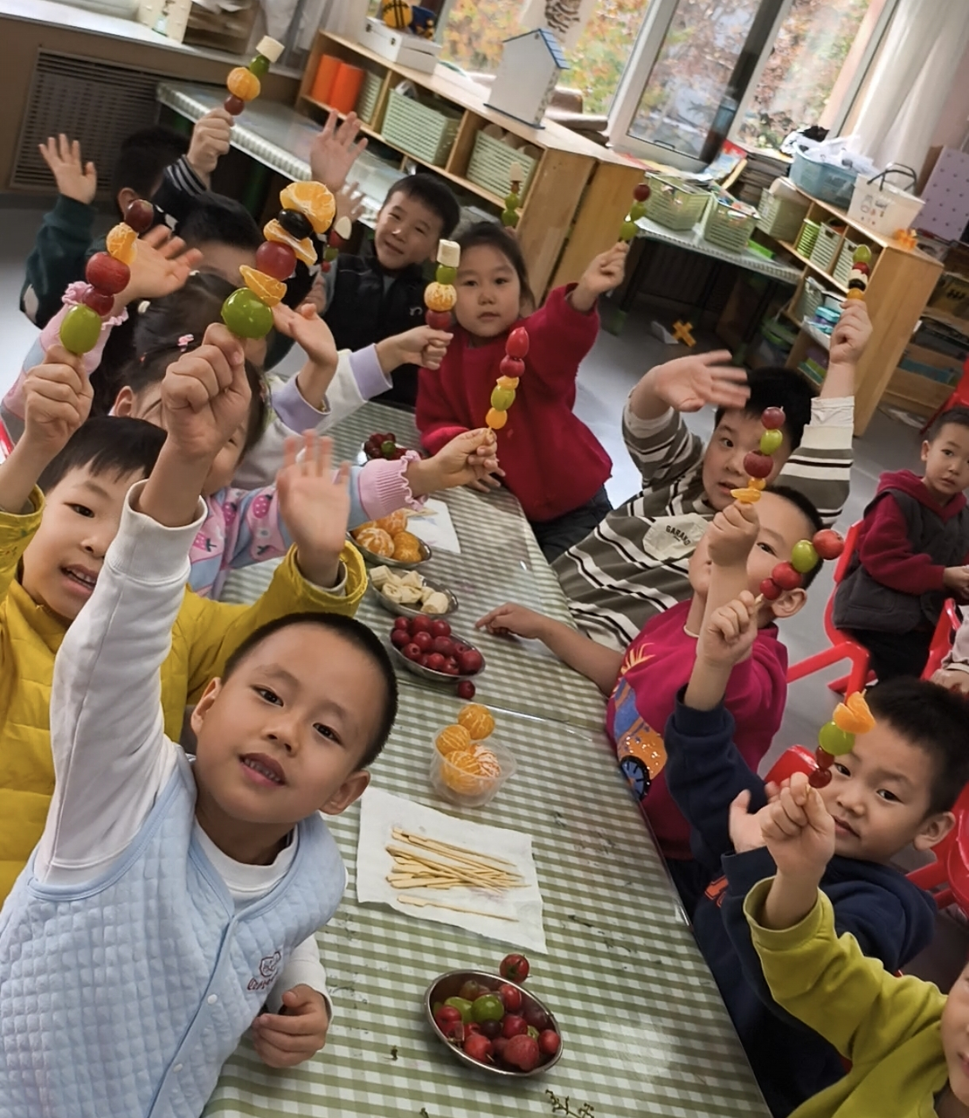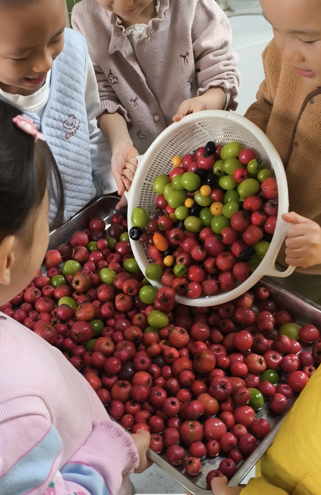 活动伊始,老师提前准备好新鲜的山楂、圣女果等食材,向孩子们介绍了糖葫芦的起源与制作流程。在老师的指导下,孩子们化身“美食小工匠”,有条不紊地投入到食材处理中:小心翼翼地剥去山楂蒂、仔细清洗每一颗果实、用纸巾轻轻擦干水分,再按照自己的喜好将食材整齐串起。过程中,孩子们互帮互助,有的分享串签技巧,有的提醒同伴注意安全,小脸上满是认真与专注。