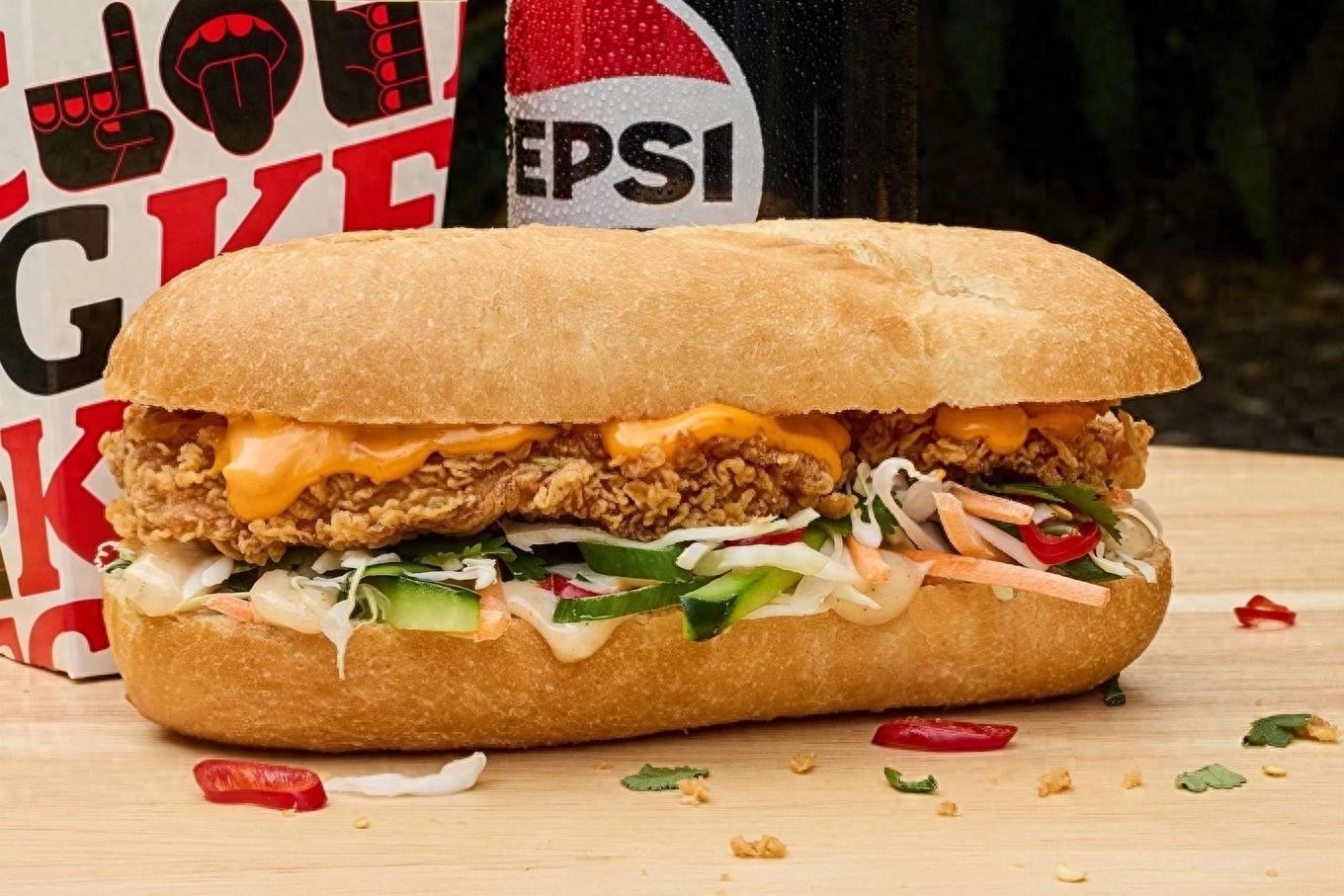 它的主要成分是KFC的Zinger鸡排,配上卷心菜沙拉、辣椒、香菜、蛋黄酱和辣味超级酱料,包在一条法棍中。