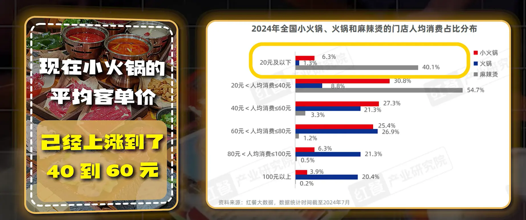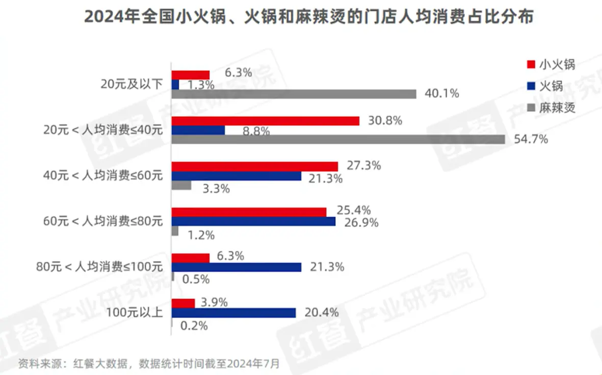 红餐大数据印证了这种变化:2024年小火锅行业人均消费60元及以下的门店占比超60%,其中40~60元区间占27.3%,客单价逐年攀升,快餐品质却配不上正餐价格。​