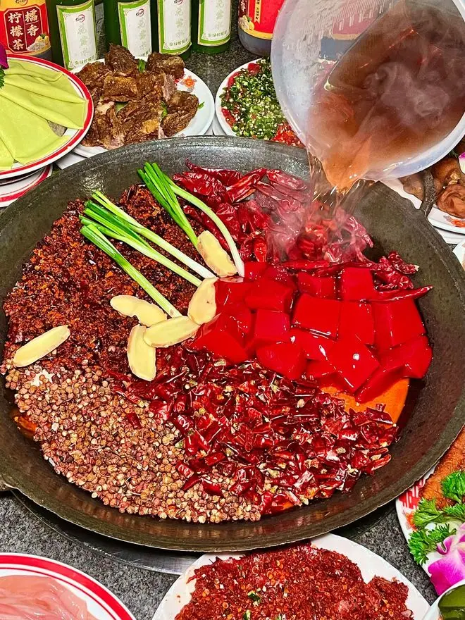 重庆火锅的牛油锅底堪称视觉奇观——凝固时如赤色琥珀,煮沸后化作翻滚的岩浆。五斤牛油打底是当地老师傅的底线,搭配郫县豆瓣、茂汶花椒和子弹头辣椒,在高温熬制中形成层次分明的"三层油":表层红亮如镜,中层暗藏香料,底层沉淀着时间的醇厚。这种近乎偏执的厚重感,让食材在涮煮时能瞬间裹上浓烈香气。曾有外地厨师尝试减油降辣,被当地食客戏称为"洗锅水火锅"。