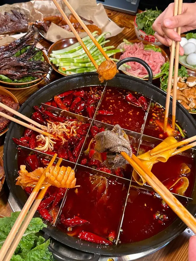 重庆火锅的江湖气渗透在每个细节里。深更半夜的巷子店,食客们赤膊围坐在九宫格前,用长筷在公共格涮煮,在私人格焖煮,这种"共享与私密"的平衡,恰似山城人外冷内热的性格。某纪录片拍摄的"棒棒军火锅"场景中,挑夫们用扁担架起临时餐桌,就着江风大快朵颐,展现着市井生命的韧性。