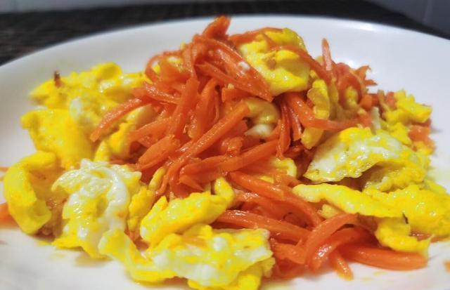 5. 合并炒制:将炒好的鸡蛋盛出后,重新加热锅中的胡萝卜丝。如果喜欢口感更有层次,可以加入少许酱油调味。将炒好的鸡蛋放回锅中,和胡萝卜丝一起翻炒均匀,确保两者充分融合。