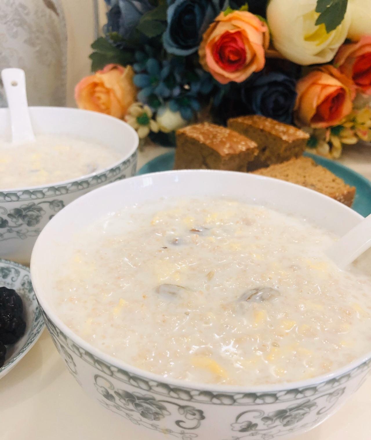 将杏仁浆和牛奶加入燕麦中,小火煮至粘稠。