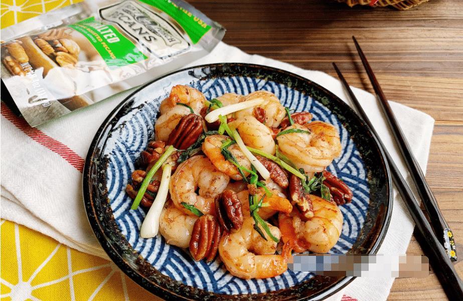 食材: 新鲜虾仁、碧根果、青红椒、葱姜。