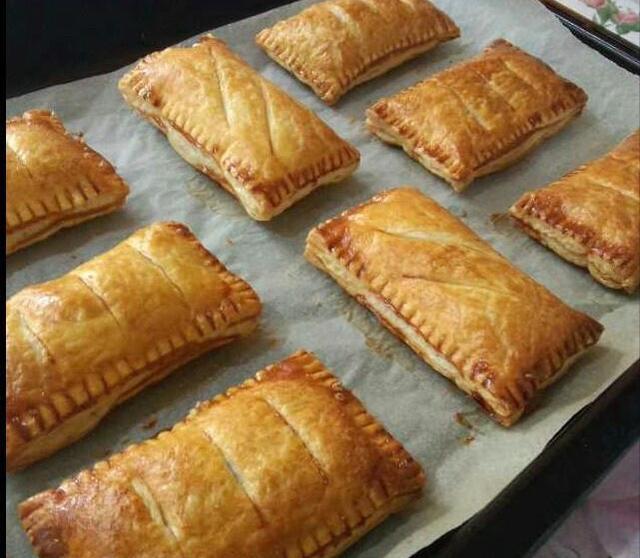 与此同时,处理现成的酥皮。在室温下让冷冻酥皮回温,直至稍微柔软。然后,用刀切割成等份,确保每一部分都能包裹住丰盈的内馅。再次用蛋液刷涂派皮,不仅能让派皮上色更加均匀,烘烤出来的颜色也会更加诱人。这些细节虽小,却是成功的关键。