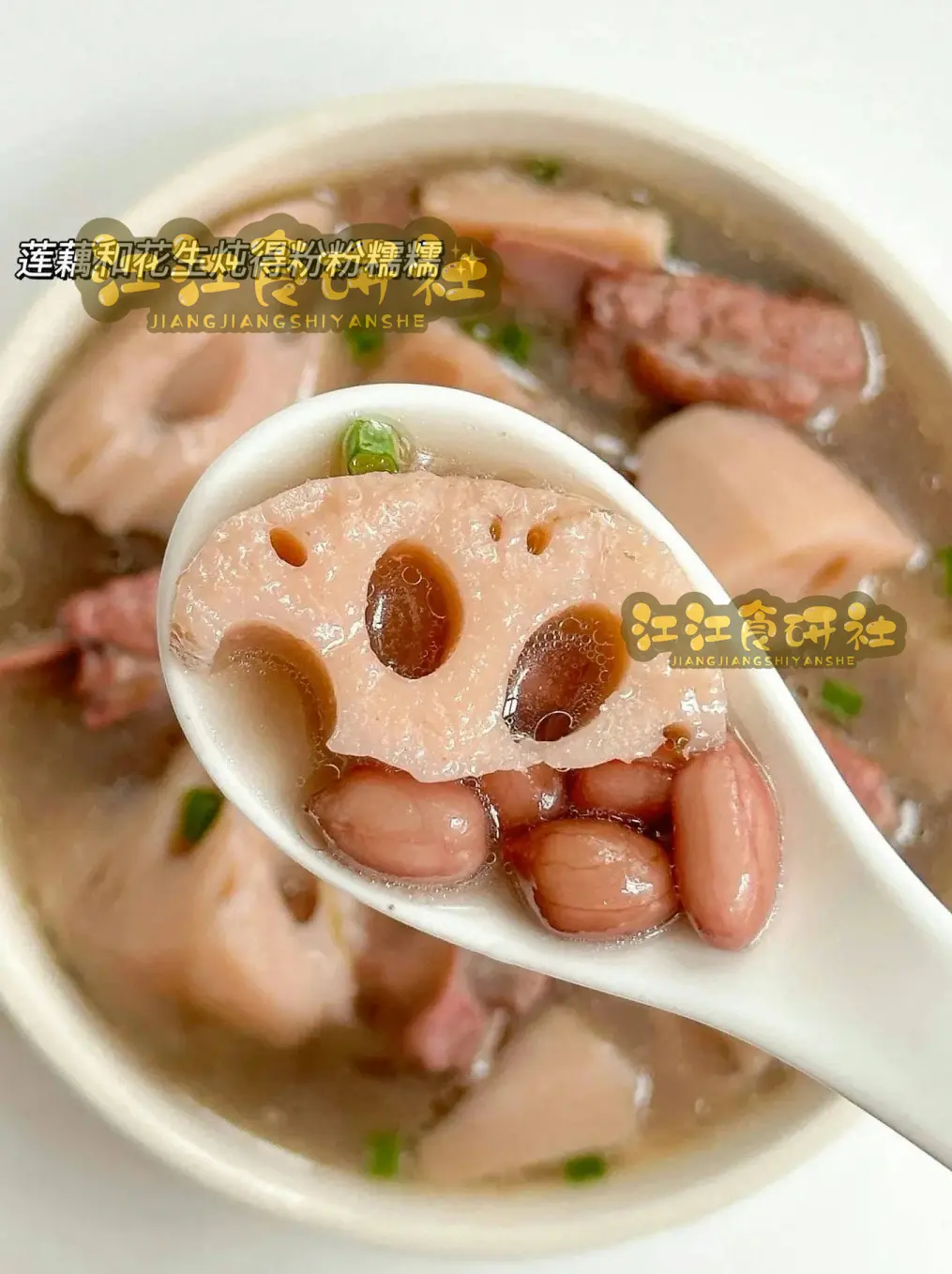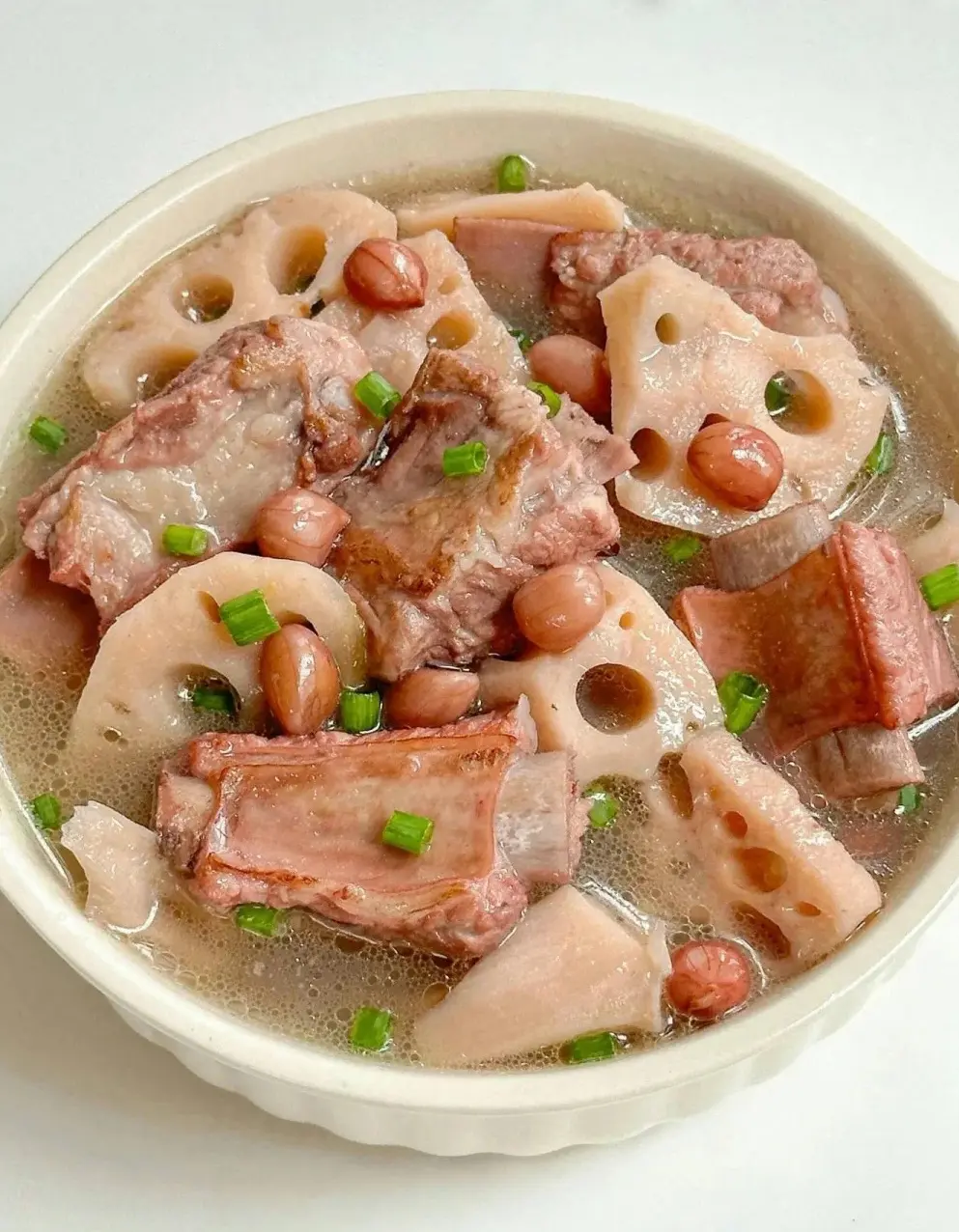 俗话说"荷莲一身宝,秋藕最养人",冬季的莲藕经过霜打后,淀粉含量更高,口感更加粉糯。搭配花生的补益功效和排骨的丰富营养,是冬日里不可多得的养生汤品。