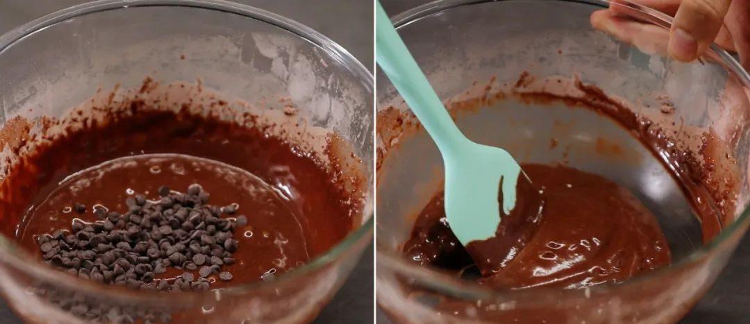 接着加入耐烘焙巧克力豆,拌匀,蛋糕面糊就完成了。