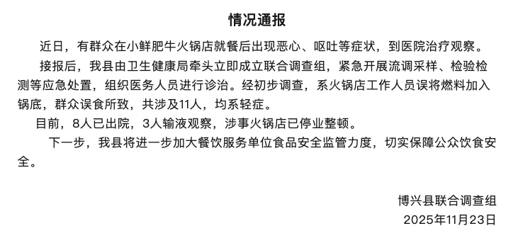 经初步调查,系火锅店工作人员误将燃料加入锅底,群众误食所致,共涉及11人,均系轻症。