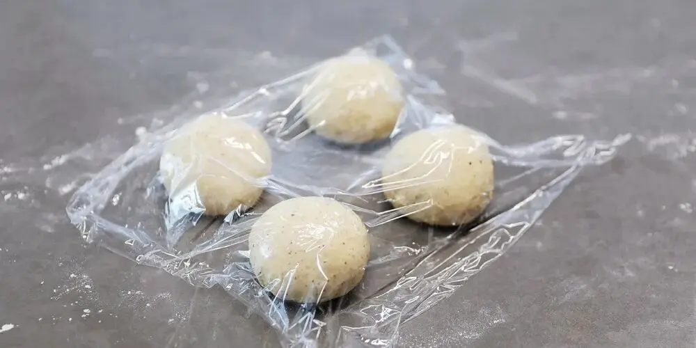 发酵后的面团完全排气,使面团重新变小,然后均匀分成4份,揉圆,盖上保鲜膜松弛10分钟。