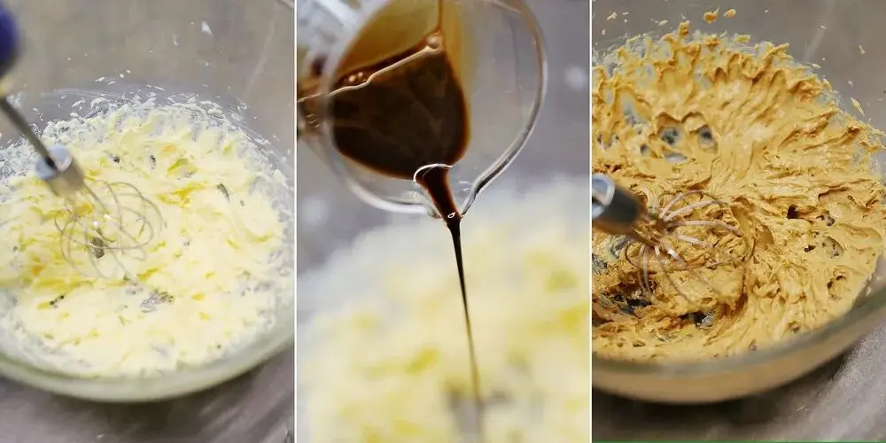 将准备好的咖啡液倒入黄油中,搅打均匀。