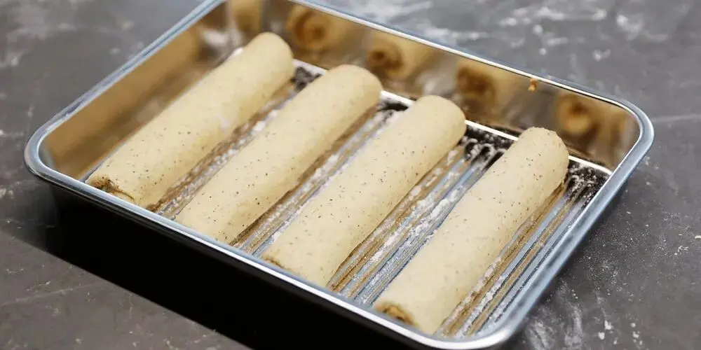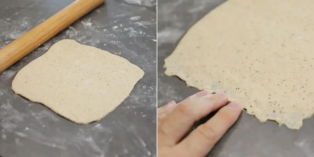 台面上撒一些干面粉防粘。取一个松弛好的小面团,在台面上压扁,擀开成为长方形。用手指在长方形一边(收尾的那一边)压一遍使这条边变得薄薄的(这样卷起来收口比较服帖)。