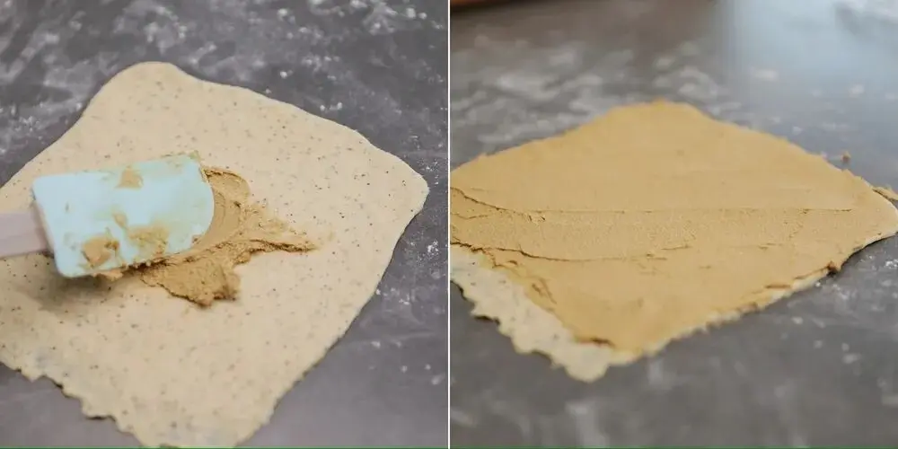 取1/4的奶酥馅,均匀涂抹在整个面团的表面(除了收尾的那一边)。