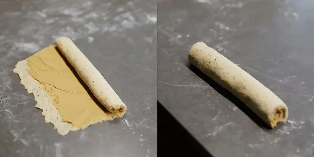将4个面团都这样卷好以后,放入冰箱冷冻室冷冻(-18℃)15分钟左右(这样可以降低面团温度,让奶酥馅变硬,切口会比较整齐。嫌麻烦的话,不冷冻直接切也可以,就是切面可能会糊掉,失去层次感)。