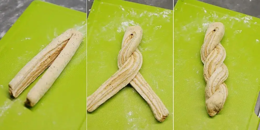 将切面翻过来朝上,然后一左一右交叉编起来。最后将收口捏紧。