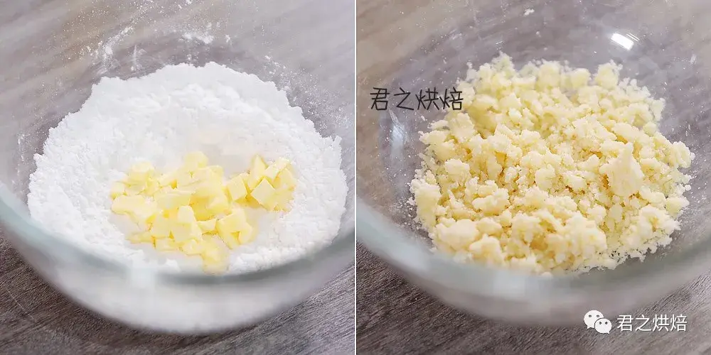 酥粒不要过度捏搓,不然会变成湿面糊状态,而不是颗粒状。