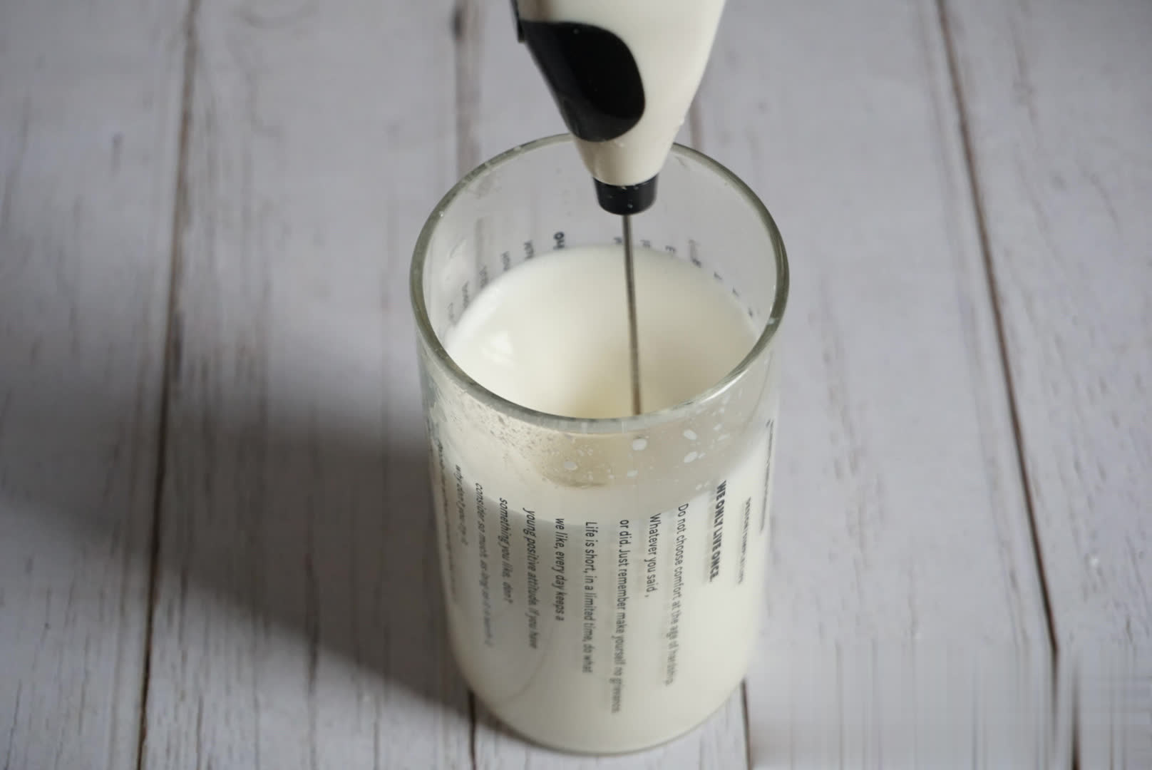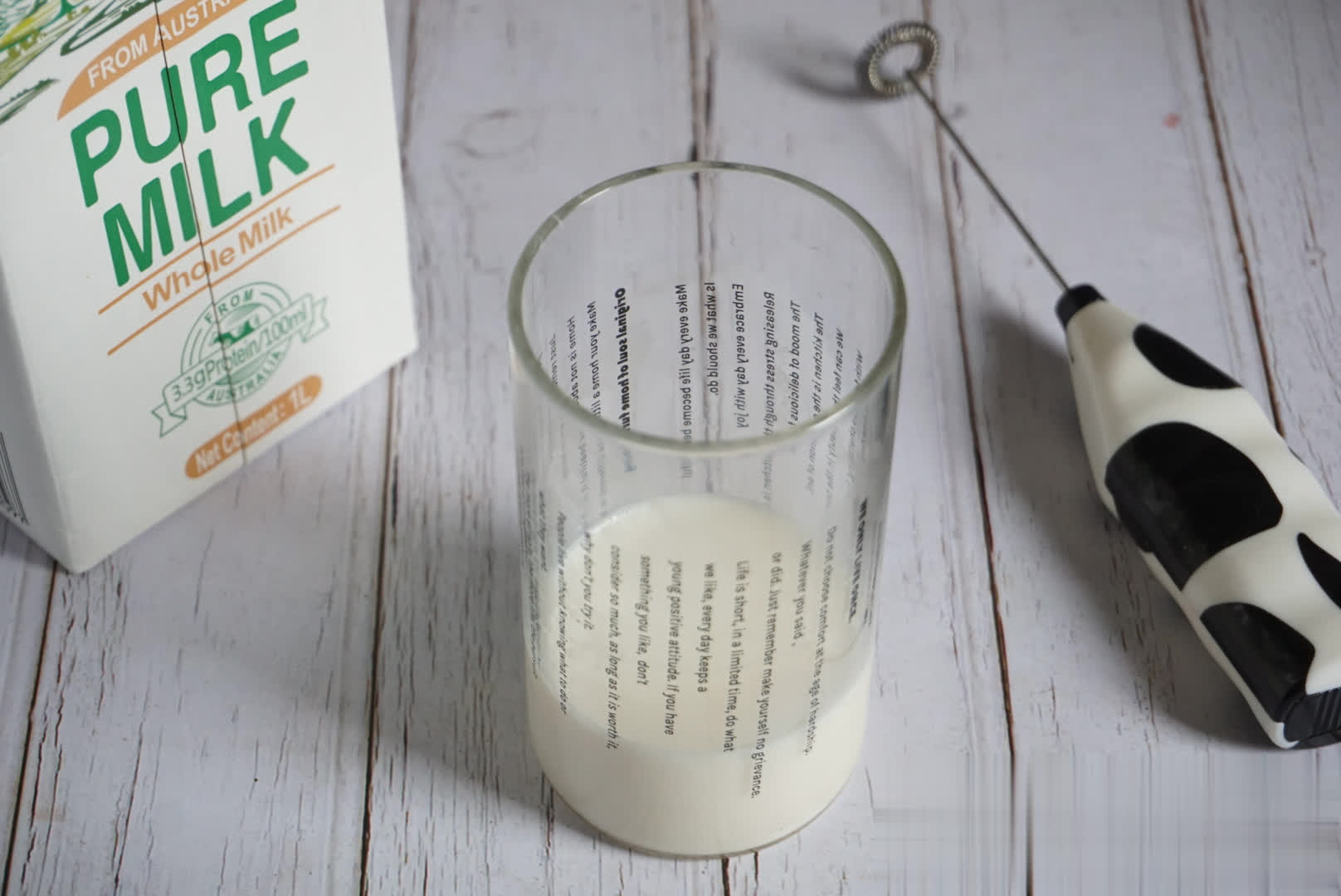 1.将牛奶放入微波炉,高火15秒加热到温热。使用手持奶泡机,放入牛奶杯中,打半分钟,奶泡是牛奶的2倍即可。