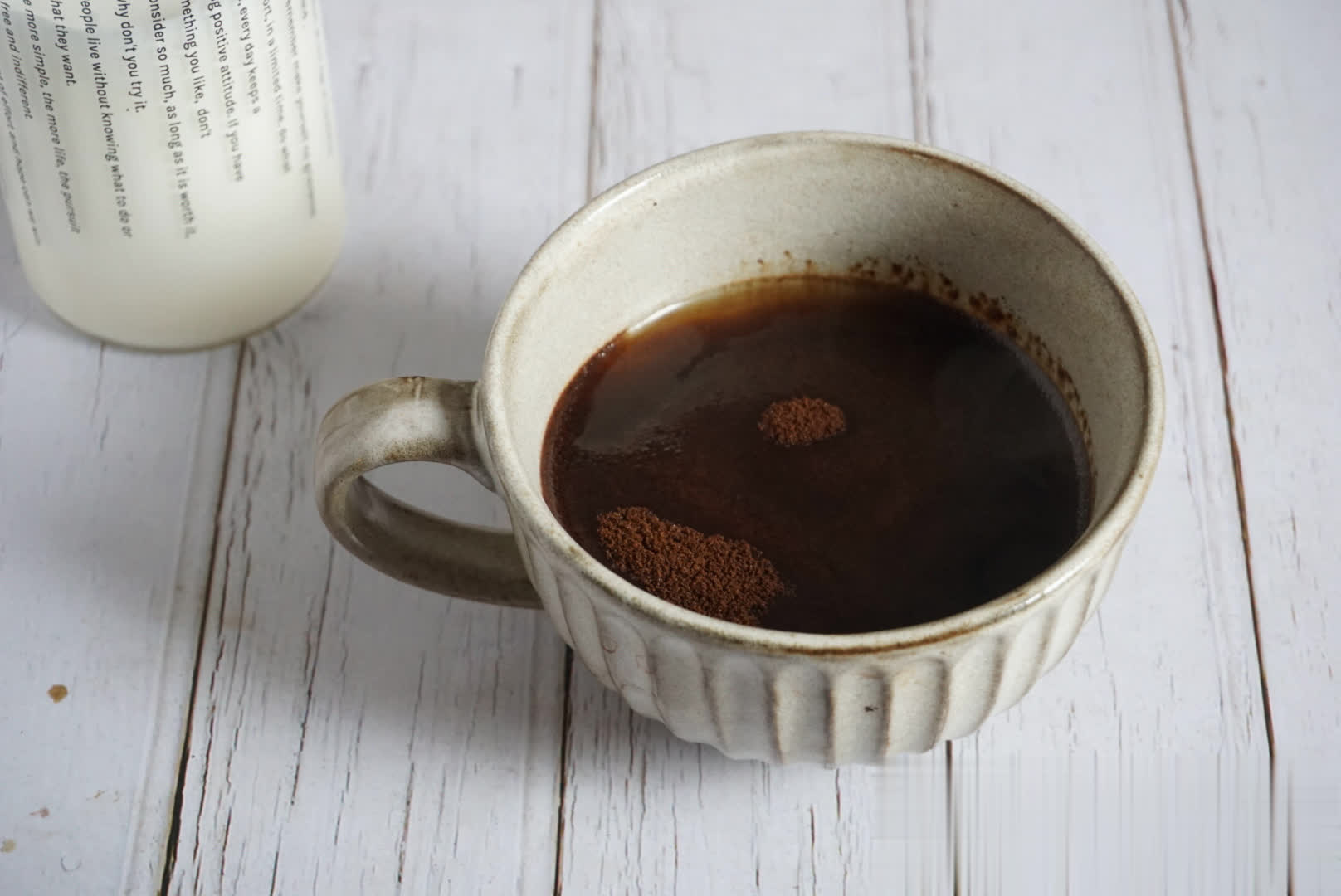 3.速溶黑咖啡粉,放入杯中,用饮水机中的热水冲泡,半杯即可。想加糖的宝宝这步加进去即可。