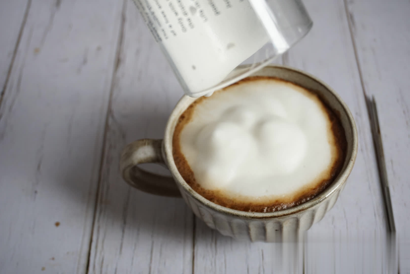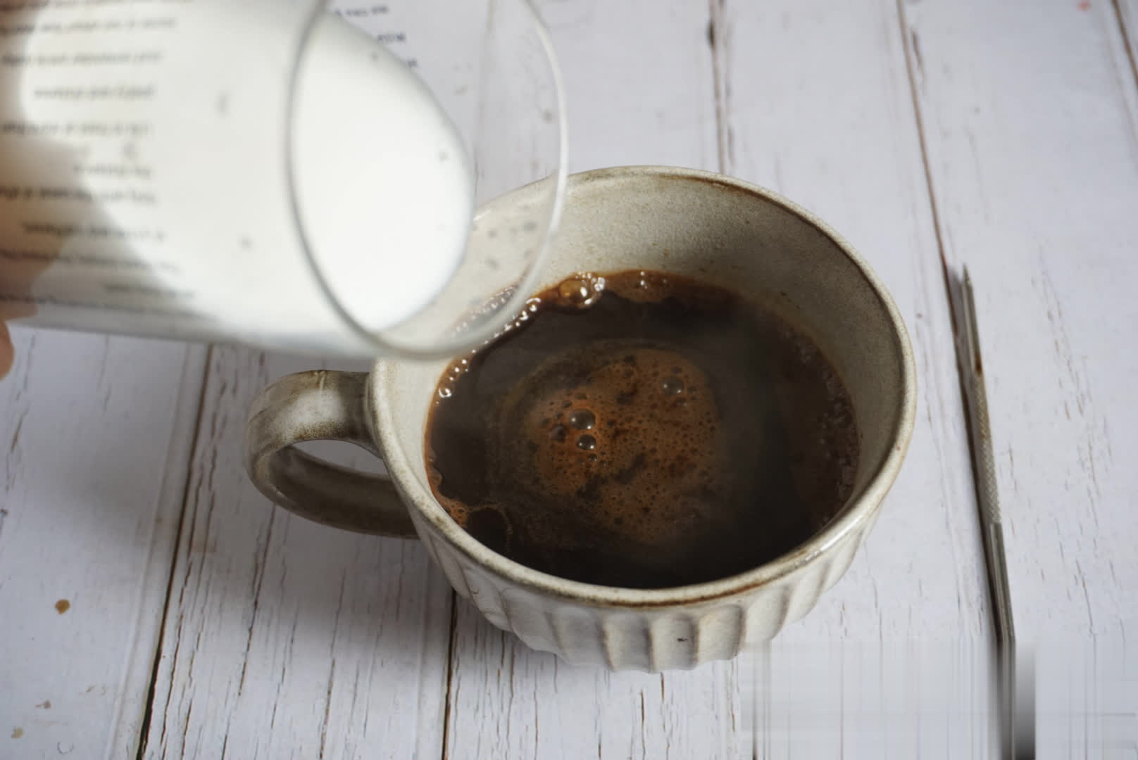 4.放置了约1分钟的奶泡,晃动一下,将奶泡缓慢倒入咖啡中。做的时候你会发现牛奶液体会先倒进去,然后是奶泡浮在表面。