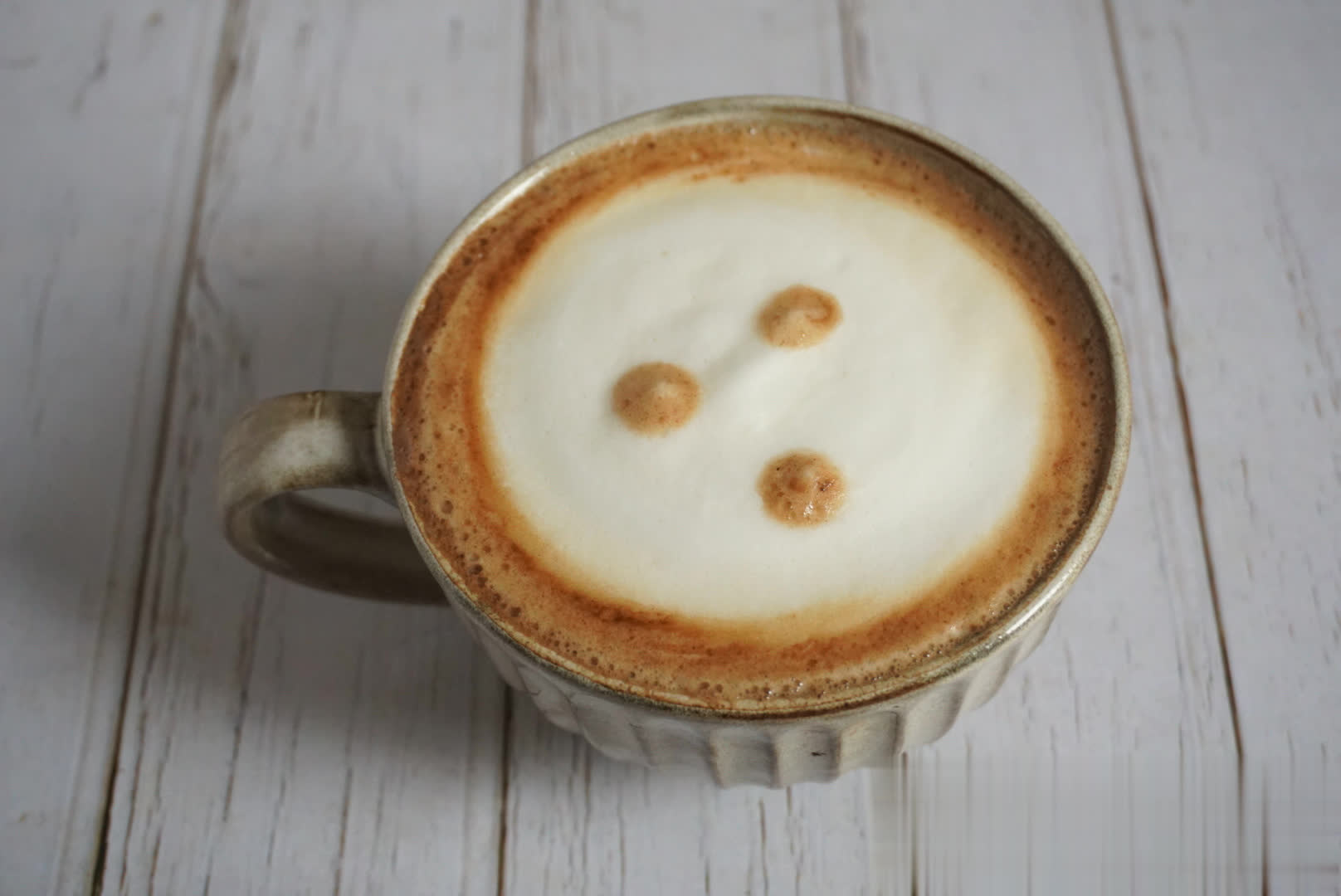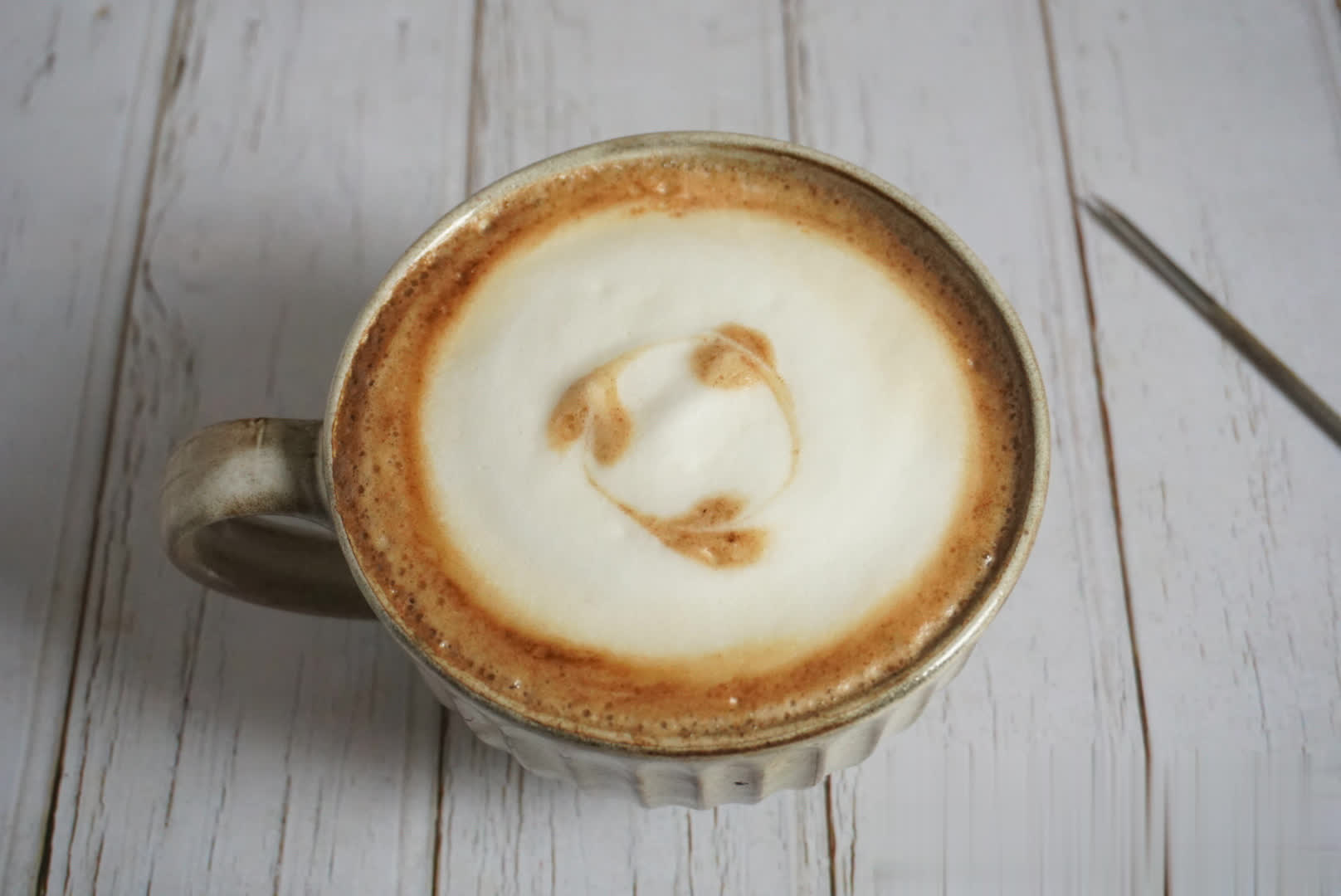 5.我们用拉花针,或者牙签在奶泡表面滑动一下,弄平就好。卡布奇诺咖啡就做好了。