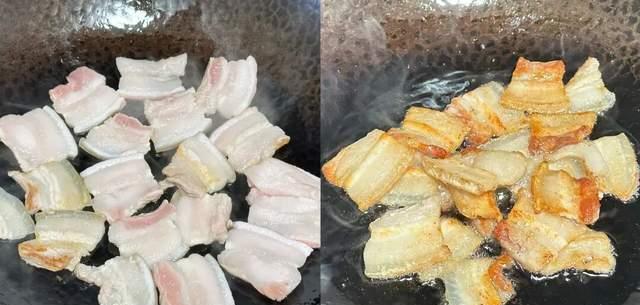 1、五花肉切成薄片,可以选择肥一点的五花肉,不用加油,把锅加热,下入五花肉小火煎至焦黄色,把油脂煎出来;