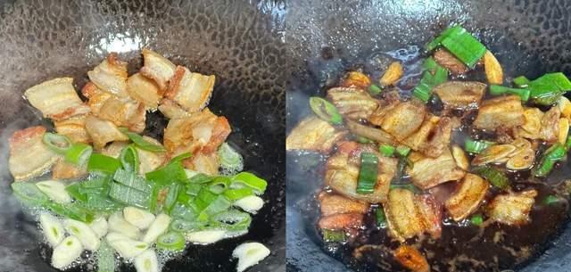 2、再加入大蒜和大葱翻炒出香味;加入生抽2勺 老抽2勺 陈醋1勺 白胡椒粉适量 姜粉适量翻炒均匀;