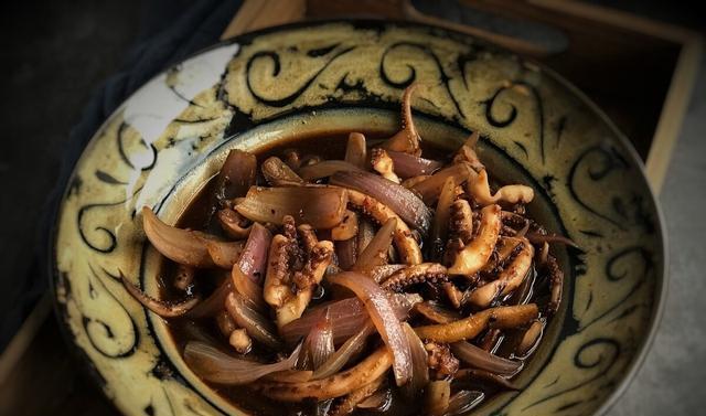 4. 炒鱿鱼:另起锅,加入少量油,将腌制好的鱿鱼放入锅中,大火快速翻炒。鱿鱼炒至变色和卷曲,即可捞出备用。