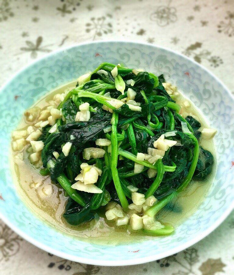 热油锅,先爆香蒜末,再加入菠菜快速翻炒。