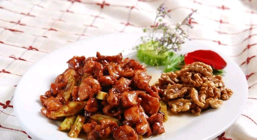食材: 鸡胸肉、核桃仁、青椒、胡萝卜、葱、姜、蒜。