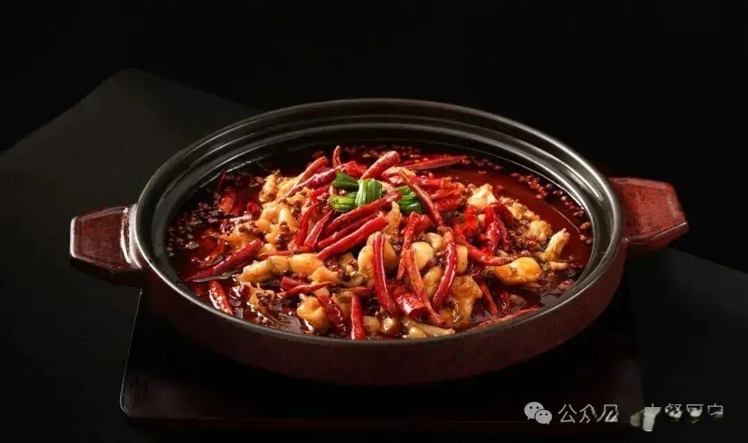 4、 待汤汁收浓,下入牛蛙,煨一分钟,装盘。将丘北辣椒、花椒盖在牛蛙上,浇热油激发香味,即可带火上桌。