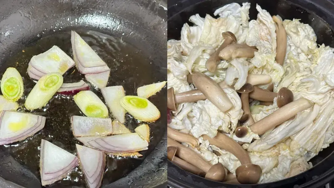 1、砂锅里加入少量油,加入洋葱半个和一些葱段翻炒出香味,再把白菜和鹿茸菇一起翻炒至变软;
