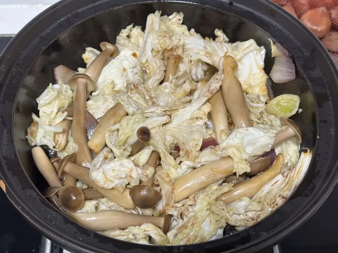 最妙的是底下的白菜和鹿茸菇。一开始它们只是垫个底,谁知焖煮过程中吸饱了海鲜的精华,变得比主菜还抢手。白菜炖得软烂入味,鹿茸菇带着独特的香气,每一口都饱含汤汁,有时候我觉得这些配菜才是这道菜的精华所在。