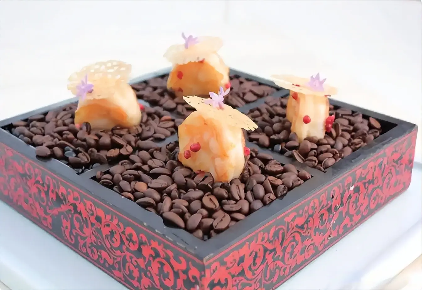 大明虾4 只(约400 克)、巴西红胡椒10克、虾泥20克、姜葱汁、盐、料酒、味精、生粉、面粉、色拉油各适量。