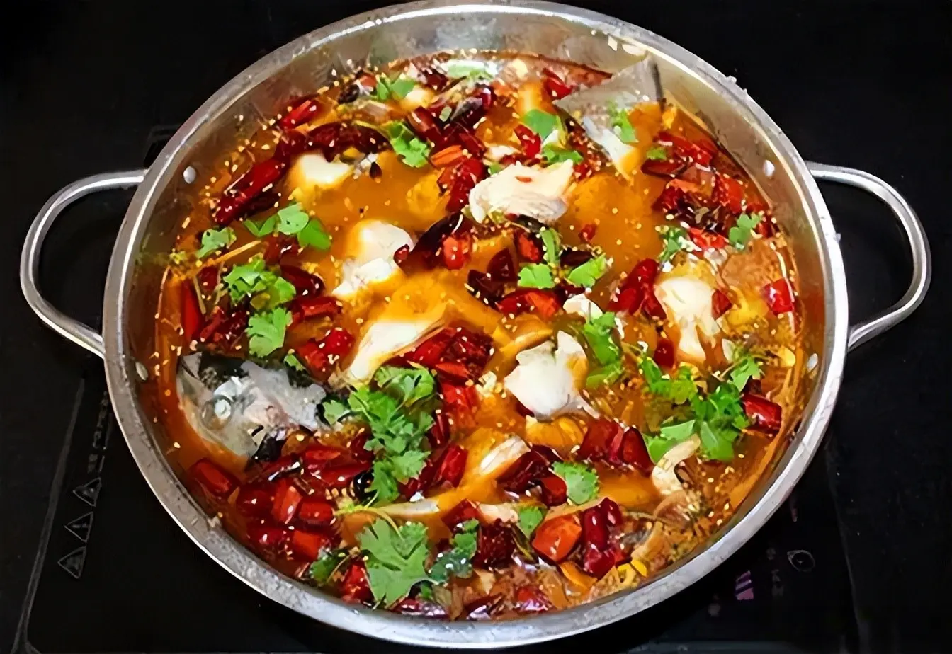 3.锅上火,放入秘制麻辣料,小火慢慢熬化,下入葱段、姜片炒香,放入鱼身和清水500克,大火烧开,改中火烧10分钟,用盐、味精调味,捞出鱼身,放入垫有黄瓜条的盆内,将鱼片放在鱼身上,鱼头、鱼尾摆在两端。