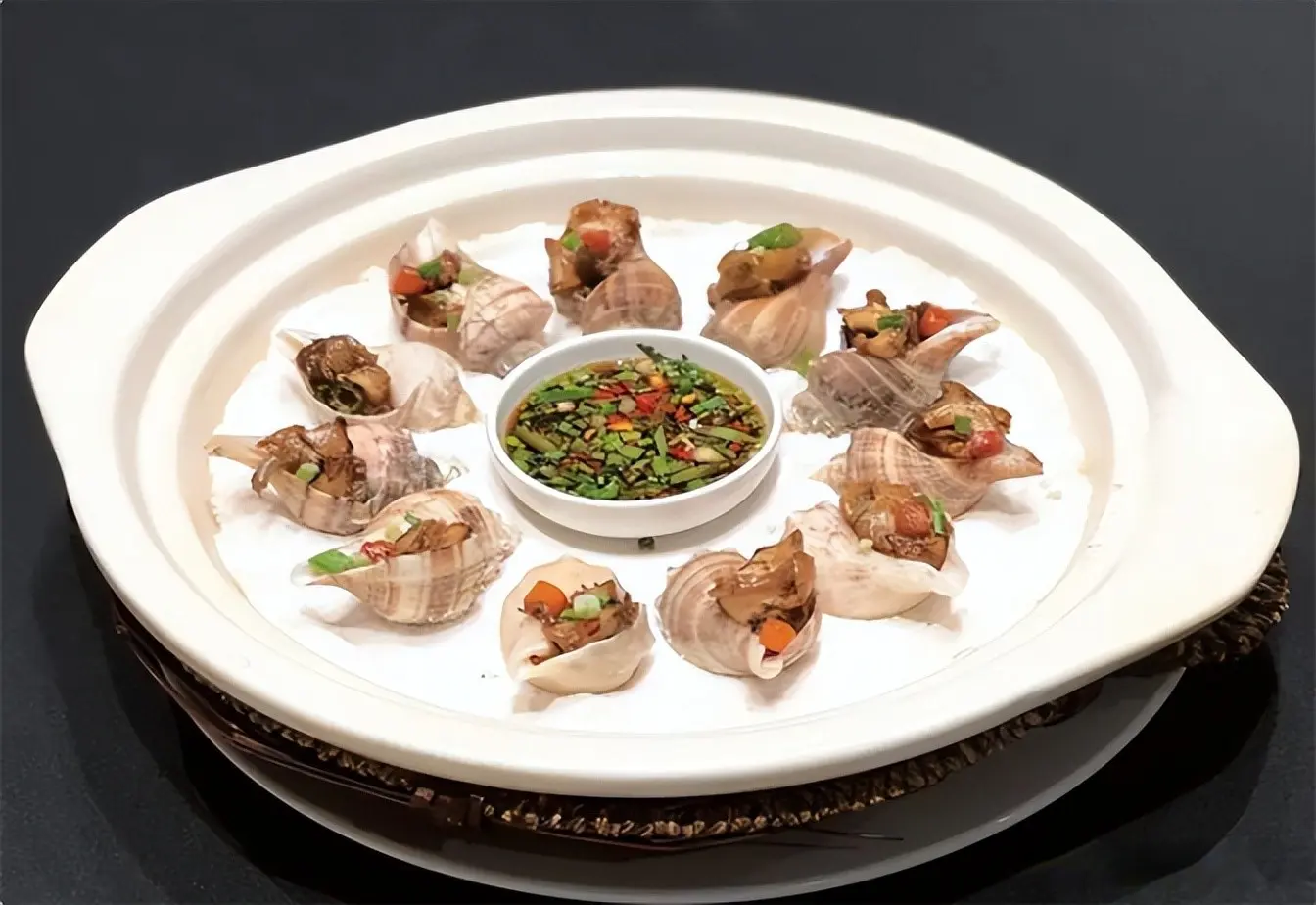 说明:此菜做法突出调味和螺肉鲜味的融合,口味偏复合。也可将治净的螺肉放入加有姜片、葱节的水锅煮熟,再随酸辣蘸碟上桌。蘸碟味道要浓厚,醋味需略重一点,这样才能更好地突出螺肉本身的鲜甜。