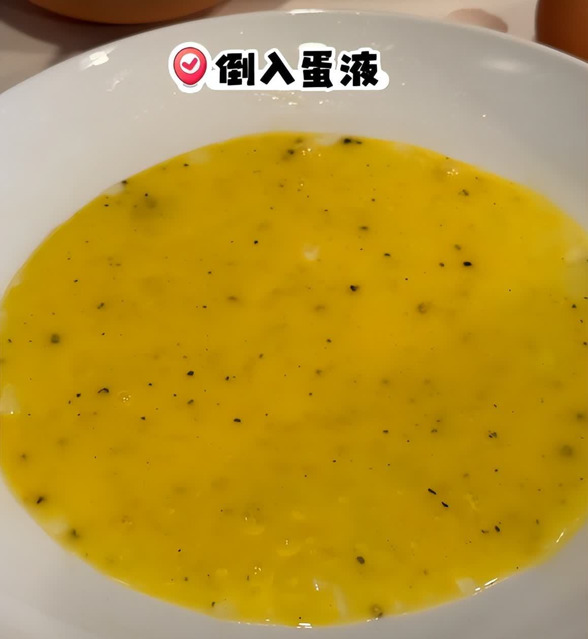 在蛋液上面放上一些自己喜欢吃的蔬菜、肉(可以放培根、菠菜、生菜都可以)